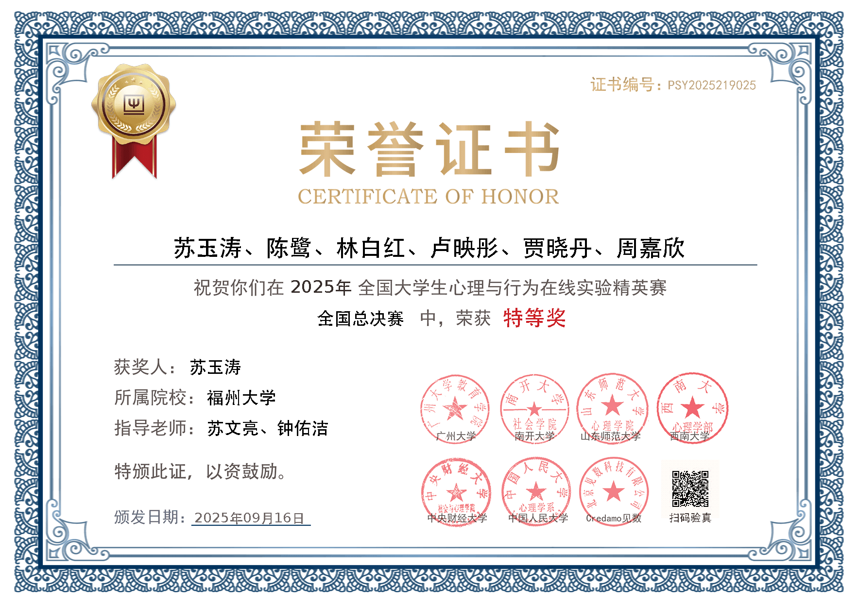 2025年11月15日,第三届全国大学生心理与行为在线实验精英赛总决赛在中央财经大学圆满落幕。来自我校成人网心理系2023级和2022级本科生苏玉涛、陈鹭、林白红、卢映彤、贾晓丹、周嘉欣组成的“神经元蹦迪组”,在苏文亮教授、钟佑洁副教授的全程指导下,历经六个月的系统备赛,在校赛、分赛区赛及全国总决赛中一路过关斩将,最终从全国323所高校的929支队伍中脱颖而出,勇夺全国总决赛特等奖!这是福州大学学子首次晋级该赛事全国总决赛并一举斩获最高奖。