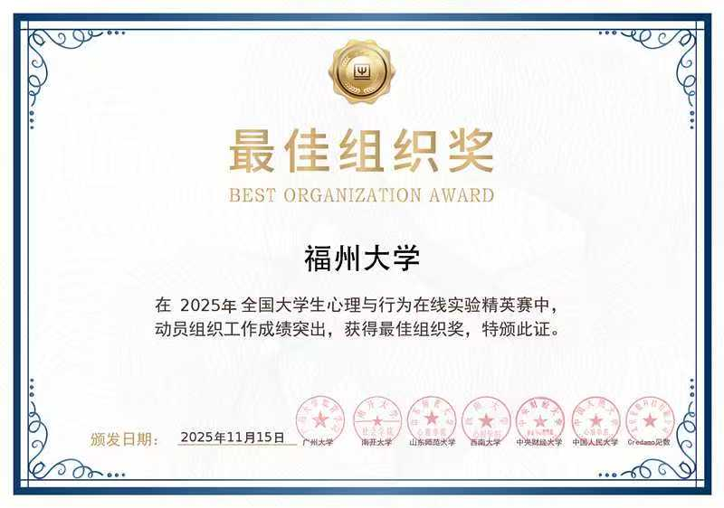 此外,福州大学还荣获“最佳组织奖”奖项,苏文亮老师获评“年度十佳指导老师”,钟佑洁老师获评“优秀指导教师”,成绩斐然,充分展现了我校在心理学教学与实践创新方面的综合实力。