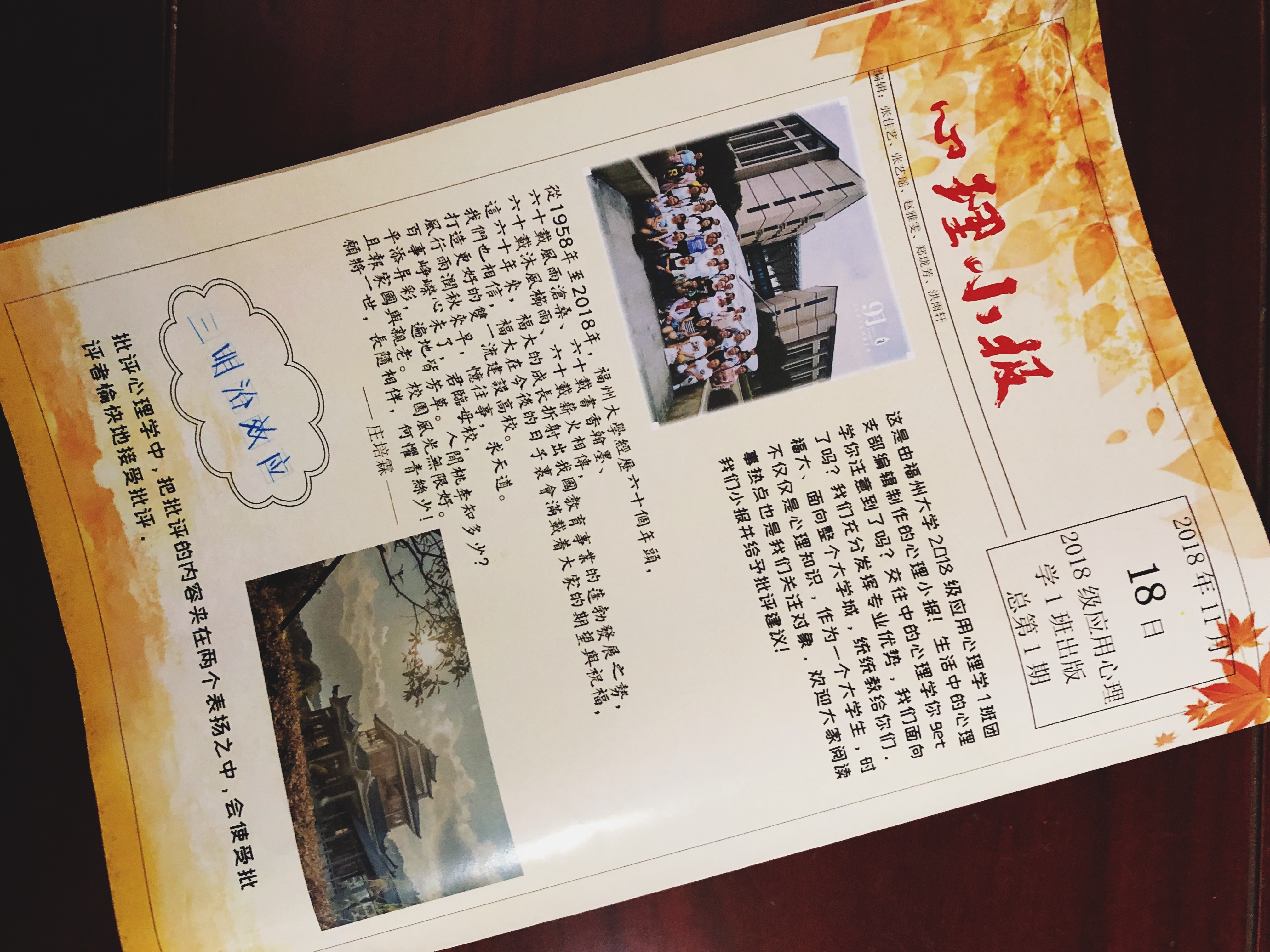 由18级应用心理学1班团支部出版的心理小报引起学生们的广泛关注,为了更好地服务于学生,18级应用心理学1班的同学用心收集相关心理学知识并制作成心理小报。