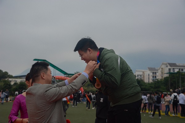 在前两轮比赛中,韩磊同学凭借优异成绩获得进入决赛的资格。经过一轮轮的投掷,运动员们的体力下降,但韩磊同学并没有因此慌张不安,而是坚定信念、调整心态、不言放弃,继续比赛。最终韩磊同学以33.87米的优异成绩位列第三。