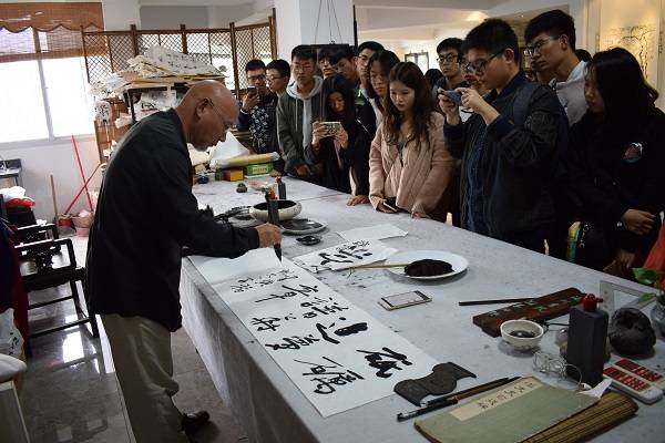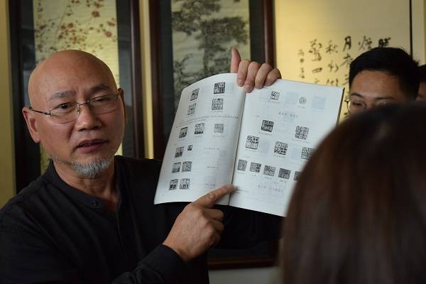 在活动中,同学们拜访了福建省篆刻协会执行会长、福建省书法家协会主席吴昌钢老师,各协会分别送上了自制的方印和精美折扇。随后,吴昌钢老师与同学们沏茶畅谈,讲述了篆刻、书法的历史、各种流派,教育同学们学传统文化要全面地学习、要有自己的个性、要对生活和自然充满激情,随时保持一种“归零”的谦虚心态。这让同学们深受感触,纷纷呈上自己的篆刻、书法作品请老师斧正,老师也不吝赐教,细致指导,教诲谆谆。接着,吴昌钢老师慷慨挥毫,当即在工作室中为同学们写就“砥砺追梦谱华章”的墨宝,并盖上了自己的印章,以示对后辈学习传统文化、传承优秀精神的支持与鼓励。随后同学们和吴昌钢老师一起欣赏“金石秋韵”——福建省首届篆刻艺术展。最后,吴昌钢老师与同学们合影留念,可谓是宾主尽欢。