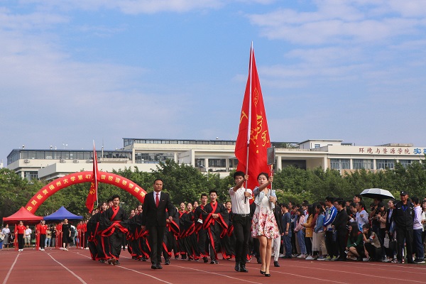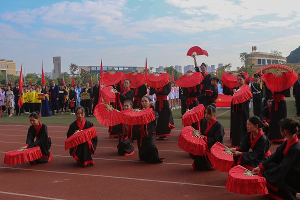 各学院方阵口号响亮,英姿飒爽,在学院领队的带领下展开各具特色的入场队列表演,展示各自学院风采。“卓越人文,精彩绝伦”伴随着锣鼓声与呐喊声,人文学子身着黑色汉服,手持红扇,以饱满的精神、矫健的步伐踏出青春的气息,在成人网团委副书记齐朝阳的带领下走至主席台前,随着《纸扇书生》的伴奏一展舞姿,纸扇飞舞,衣袂涟涟;后排的年少书生则手持书卷,投入朗诵,展现了他们文质彬彬、意气风发的书生气质。值得一提的是,在舞蹈结束时人文学子迅速摆出“文”字造型,彰显了成人网独特的人文气息与风貌,引来在场观众的热烈掌声。