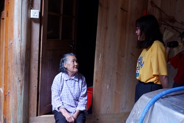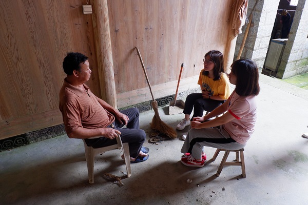 同省派第一书记的交流让实践队队员们了解到,由于历年来利洋村没有合适的产业发展,经济开发有限,已经流失大量青年劳力,目前村里只剩下了留守老人。平日里村子行人稀少,各家大门紧闭,显得较为冷清。实践队的到来瞬间为村子注入了新鲜活力。村里的老人面对突然到来的年轻人,显得惊喜又兴奋。实践队队员们同其说明来意并与之亲切交谈,虽然语言不通使得双方的交流稍有不便,但老人们的热情感染着队员们,双方的交流因为情感的联结而跨越了语言的屏障,采访现场温暖和谐。
