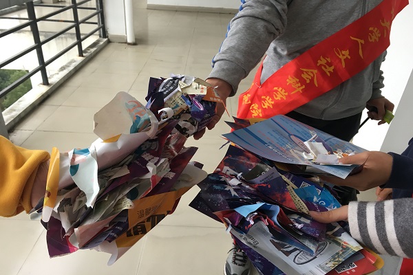 此次小广告清理志愿活动包括学生公寓内各宿舍门、楼道门、楼道墙体等各个角落的清理,十分细致。在清理的过程中,红会志愿者们发现,外来小广告“猖獗”情况严重,即使一些宿舍门前已有“禁止粘贴小广告”警示牌,粘贴的小广告数量仍没有减少。甚至,在楼道消防栓上的玻璃门上也粘贴有不少小广告纸张。其实,小广告粘贴的“制造者们”往往为外来人员,更多的却是兼职的校内学生。观察到这种现象,红会志愿者们不禁思考到:各学生公寓宿舍楼内是否能设置一块区域作为“校外信息或综合类活动宣传栏”,以减少杂乱粘贴小广告的情况。