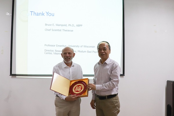 在同学们热切的期盼中,美国职业心理学委员会认证学家、挪威维克松Modum Bad精神病学研究中心主任、威斯康星大学荣誉退休教授、当今世界上最有影响力的心理咨询过程和效果研究领域的学家之一、心理治疗研究领域集大成者Bruce E Wampold博士走上了讲台。Bruce E Wampold教授以幽默的语言讲述了自己从事心理治疗研究的趣事和心路历程,通过对心理治疗模型、心理治疗关系的形成、真实关系、安慰剂、特定活动、CBT治疗抑郁症等多方面的科学讲解为在座的各位心理学专业的同学普及了前沿心理学知识。Bruce E Wampold教授以其丰富的心理学知识、严谨的科研精神以及对心理治疗的独特理解获得在场同学掌声连连。问答阶段里,Bruce E Wampold教授的认真解答更是让同学们受益匪浅。讲座尾声,成人网党委林秋生书记代表福州大学向Bruce E Wampold教授赠送了礼物,希望本次讲座能够更好地提升成人网