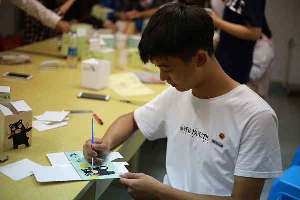 2017级社会学1班团支部带领团内成员利用旧卡纸制作垃圾盒并在其上手绘熊本熊等卡通图案形象进行包装。