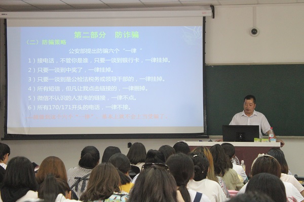陈全成老师以两起校园诈骗的实例为开头,以实例向同学们强调了安全的重要性,接着介绍福州大学现有的安全教育方式,特别指出了福州大学“互联网+大学生安全教育前置”安全教育方式。讲座的主体内容,陈老师分别围绕防盗窃,防诈骗,防火灾,防交通事故,防意外伤害事故等五个方面,详细认真地向新生讲述了生活、学习、工作中需要注意的安全事项。
