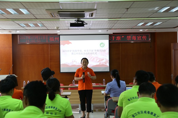 7月11日,福州大学“防毒于微,杜毒于渐”禁毒实践队晋江实践活动启动仪式于晋江市青阳街道社区禁毒康复综合中心正式举行。晋江市公安局禁毒大队长李明星、禁毒大队教导员庄剑能、政工室副主任杨周阳以及福州大学校团委王三强副书记、福州大学成人网团委叶阁泽书记、福州大学成人网心理学系主任赵陵波老师出席本次启动仪式,社工人员与实践队全体队员也准时参与本次仪式。