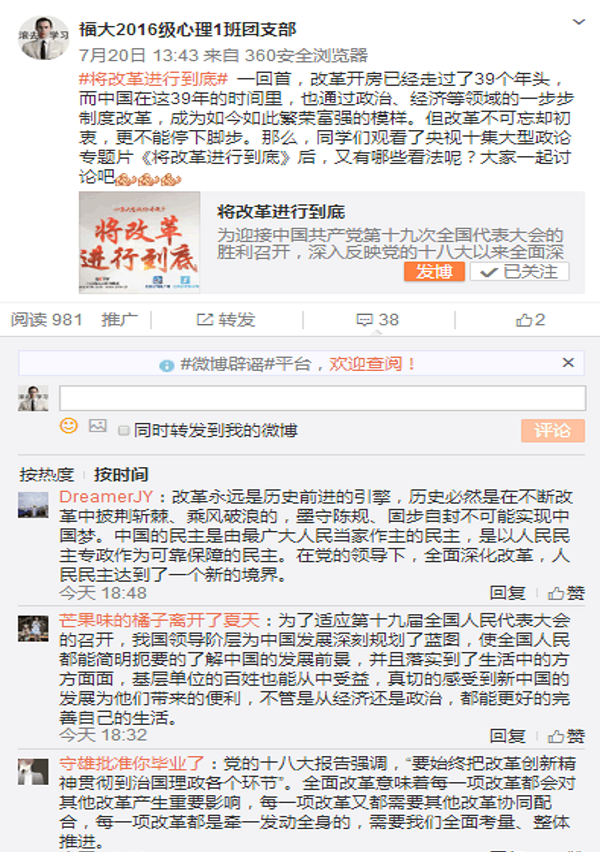 成人网各班级团支部通过利用班级官方微博、qq空间直播、易班等社交新平台、新形式组织大家线上讨论,在思想碰撞中促使学子对改革有更加深邃、成熟的看法和收获。在直播期间,进行直播的小主持人还对视频中所举的例子做出了适当的解释和普及,使同学对党和国家的方针政策有了更深入的了解和学习。除本院学子外,有趣的直播形式还吸引了众多好友加入直播间,大家纷纷各抒己见、热情分享自己的观看收获和成果,充分扩大了本次学习讨论的影响范围。